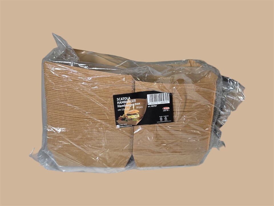 - Box Kraft Hamburger: realizzati in resistente carta kraft, perfetti per mantenere i tuoi hamburger caldi e freschi.
